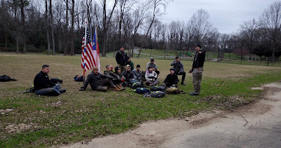We got a history lesson, and near the end, the flag fell because it wasn't very secure in the ground. Three cadres, 14 participants, one dropped flag. It was pretty far into the night. Everyone was anxious about what was about to happen. We got the flag back up. We looked at each other for a few moments. Then Cadre Aaron said that we should do something to apologize to the flag. I was getting ready for PT, but he suggested having us say the pledge of allegiance, so I led that as TL. We stuck around a while longer, listening to the Cadres share some interesting stories about their time serving, and then we got a new TL and continued on.
